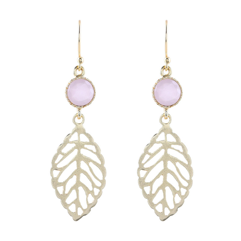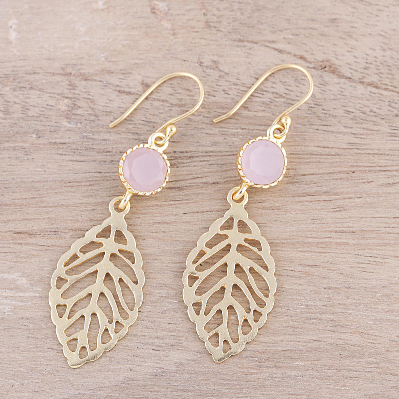 Realized in elegant openwork, two leaves crafted of 22k gold plated sterling silver display the beauty of Jaipur handicrafts in this pair of dangle earrings from India. Vivek Nathany designs the gleaming pair, set with stones of pink rose quartz.