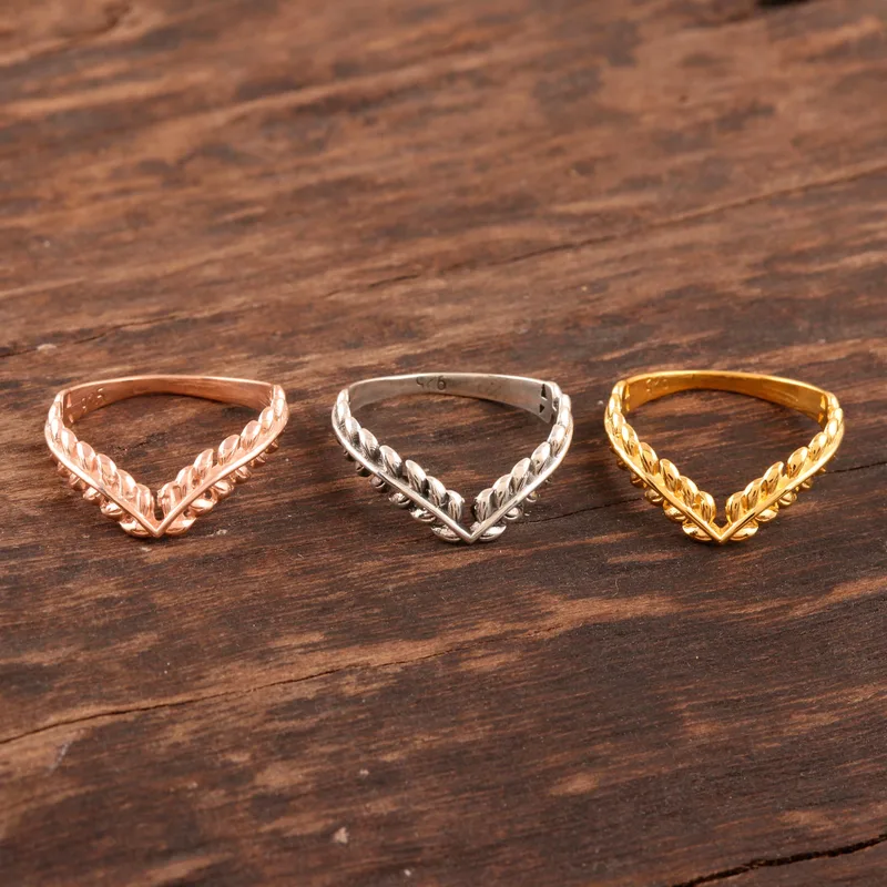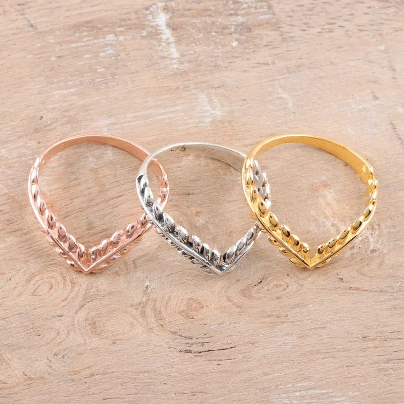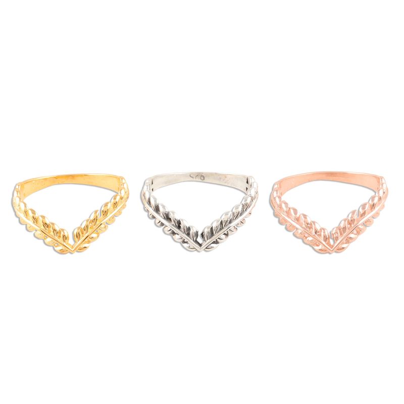 This trio of delicate leaf motif rings can be worn together or separately and sport a design reminiscent of a laurel wreath. Indian artisan Bhavya Jain crafts the rings in 925 sterling silver, then applies 18k yellow gold plate to one and rose gold plating to another--leaving the third in its original lustrous silver finish.
