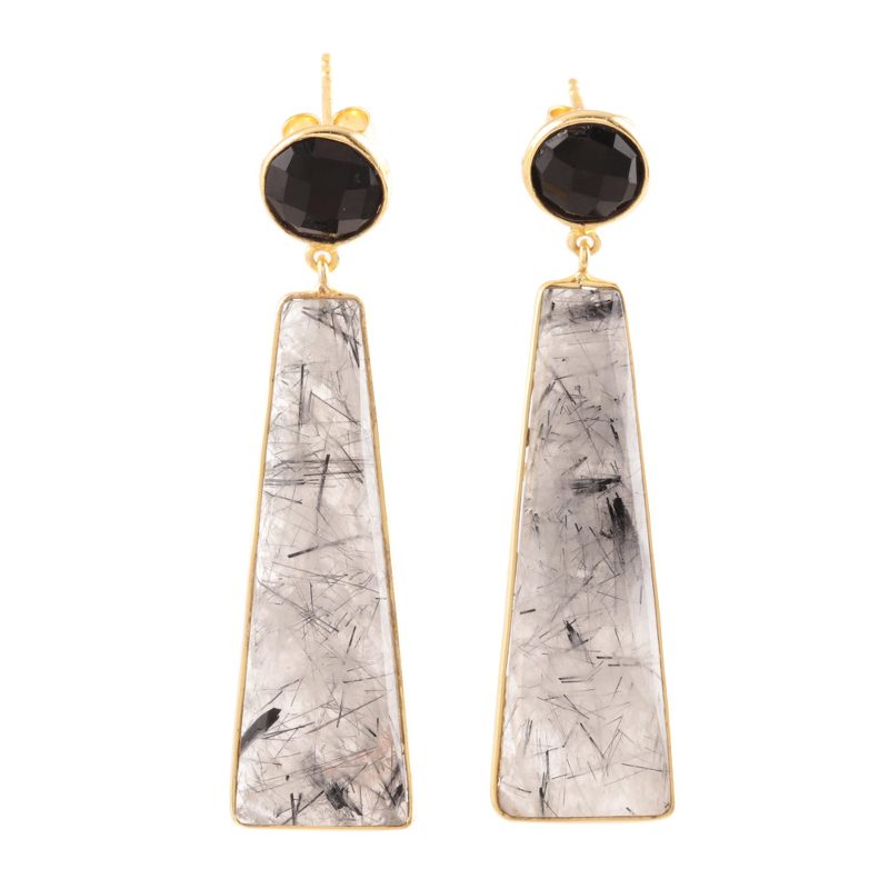 Resembling elegant towers, two faceted gemstones of tourmalinated quartz dangle. Neetu Barathi designs these 14.5-carat Indian earrings, which are crafted with high-polish sterling silver. Glittering onyx studs adorn the ears.