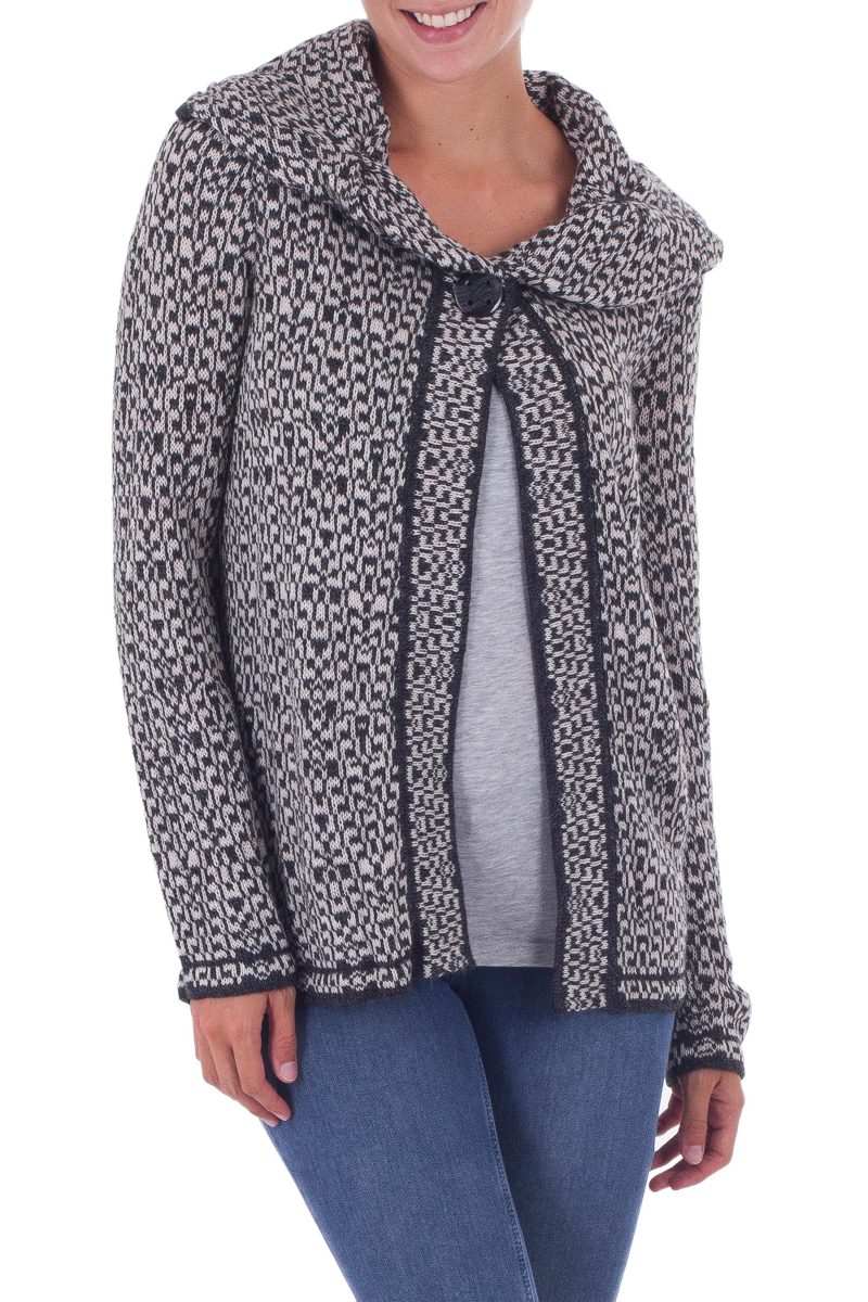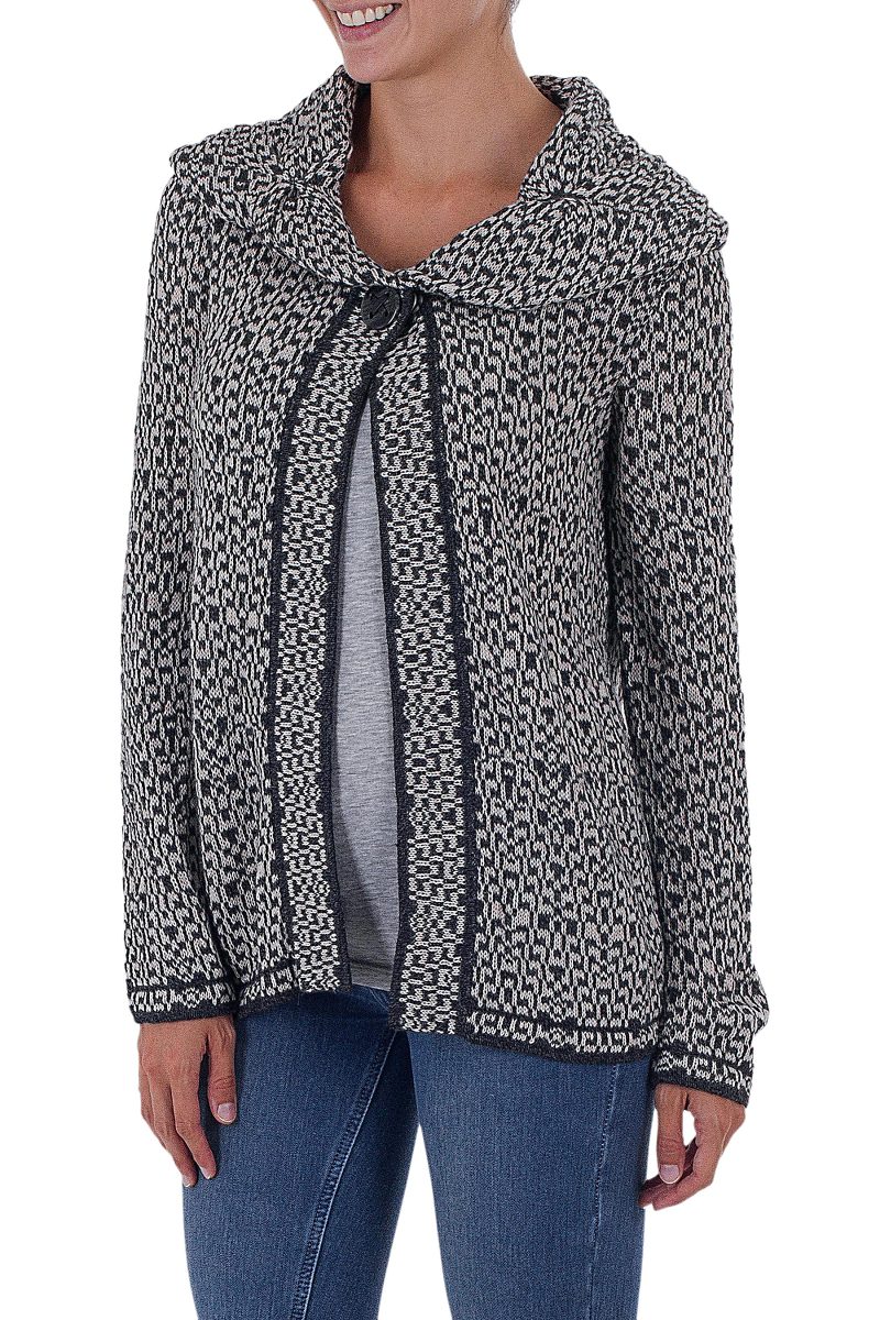 You can find our alpaca blend cardigan 'Snow Princess' by Pia Zavala in clothing categories such as Geometric Sweaters, Wool Sweaters and Cardigans Sweaters. Enjoy exploring these sections for other Novica treasures.