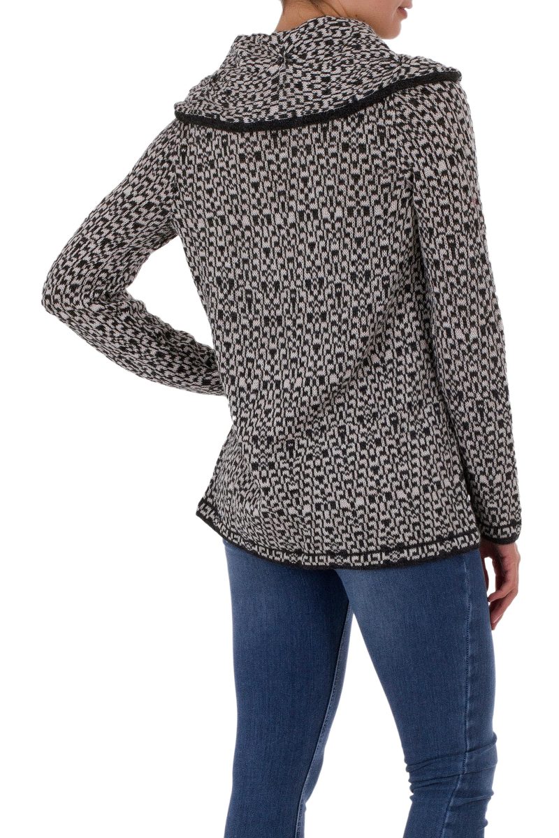 Pia Zavala designs a sweater of modern elegance. Working in a blend of luxurious alpaca wool, she selects a fascinating pattern in gray and white. The cardigan features a wide slouchy collar and closes at the neck with a single button.