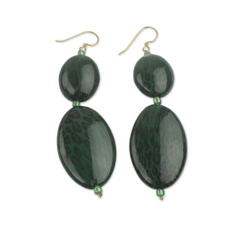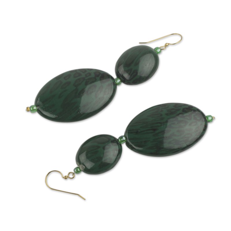 A sassy leopard print on dark green distinguishes these beaded earrings from Ghana's Rita Addo Zakour. You'll also love the fact that they are made with eco-friendly beads crafted from recycled plastic bottles. The artisan names the design adepa, which means "good thing" in the Akan dialect. The earrings dangle from brass hooks.