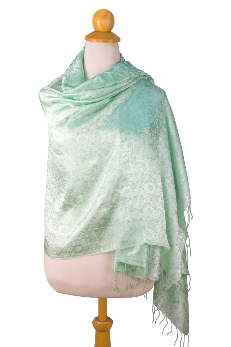 By Vinita in Thailand, this generous shawl is woven of a seductive rayon and silk blend. Luscious damask flowers appear in green on green.