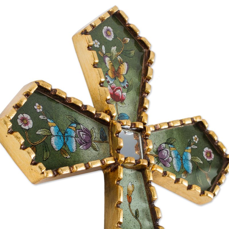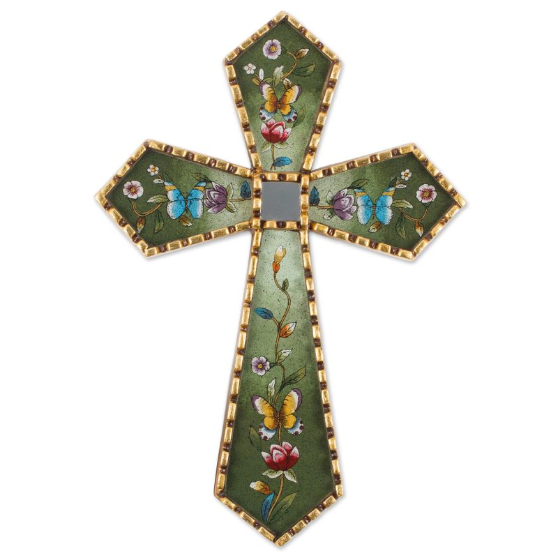 From Peruvian artisan Marcos Luzalde comes this exquisite mohena wood and glass cross. The cross features a lovely design of butterflies and flowers that is painted on the reverse side of the glass. A small mirror rests at the center of the cross, and the borders are detailed in bronze leaf.
