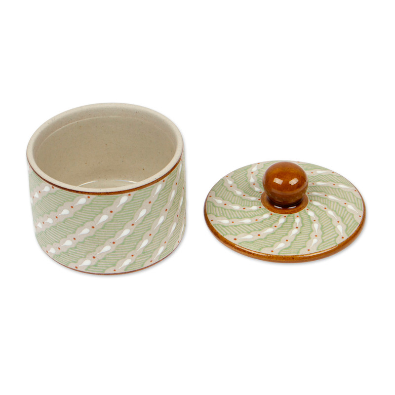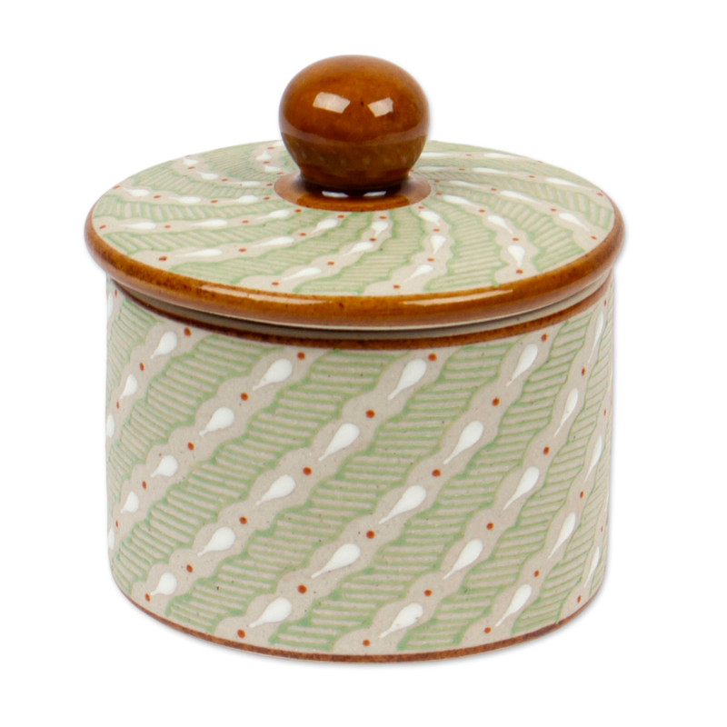 Perfect for holding beauty supplies like cotton balls and Q-tips, small desk supplies like paper clips, or kitchen essentials like rubber bands, this lovely ceramic cylindrical decorative jar is handcrafted by Mexican artisan Topiltzin Castro in the Talavera style. On the body of the container, the artisan hand-paints a motif of diagonal rows of white teardrops interspersed with warm brown dots and alternating scallop-edged rows of avocado green horizontal pinstripes. The background is left unglazed, allowing the matte, natural ivory color of the ceramic to show through. The same motif is on the lid, with the rows spiraling in to the center. The rims of the container and lid, and the lid's knob, are painted a warm brown.