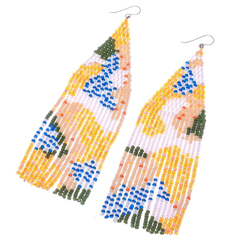 These long and dramatic earrings are designed by Siriporn in Thailand. Artisans thread tiny glass beads in orange, cream, pale pink, blue and green colors, creating a waterfall design. The earrings swing from sterling silver hooks.