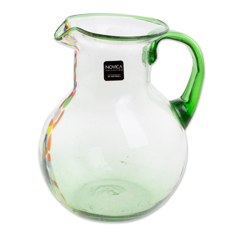 The perfect addition to your party, this hand blown recycled glass pitcher has a festive line of colorful dots running up the front. The pitcher is clear, with a green handle, rim, and bottom. The Cantel Blown Glass Artisans of Guatemala handcraft this pitcher using glass salvaged from industrial and individual sources.