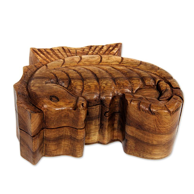 A seahorse comes to life in Balinese suar wood. By Eka, this decorative box holds a secret. Four pieces link together like a puzzle to hide personal treasures inside.