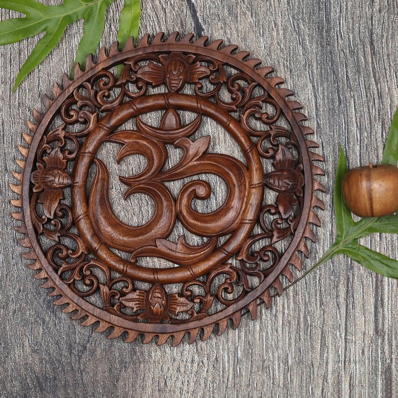 Om, a mantra used in Hinduism and Buddhism, is transformed into a stunning wall relief panel by Balinese artisan Wayan Rendah. Using local suar wood, the artisan creates a majestic round panel with accents of vines and flowers in great detail, with the ancient Sanskrit letter Om gracing the center. The natural wood grain enhances the elegant design. This fascinating wall panel would make a wonderful addition to home or office decor.