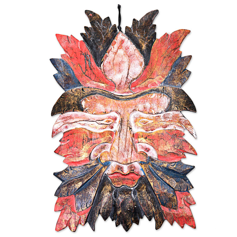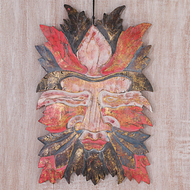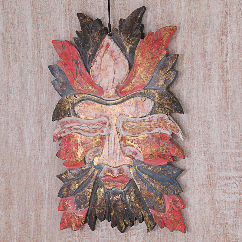 By Indonesian artisan Togog Suyasa, this hand-carved wood wall panel depicts a face covered with many leaves. With a rustic red and black finish highlighted with gold paint, this relief sculpture makes a great addition to any home.