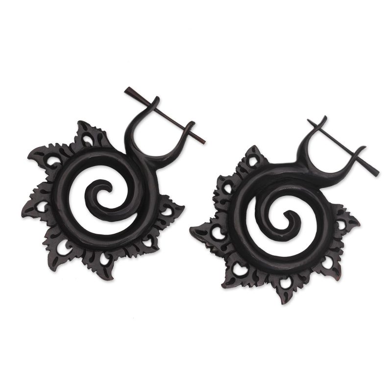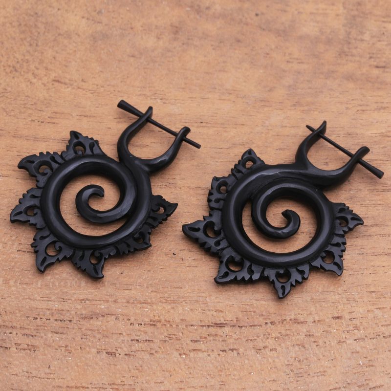 Inspired by the chakras, Balinese artisan Sukarda creates this hoop-style pair of drop earrings. Elegant spiral shapes with fanning petals are diligently hand-carved from horn in a dark hue. Each earring adorns the wearer on a removable insert post.