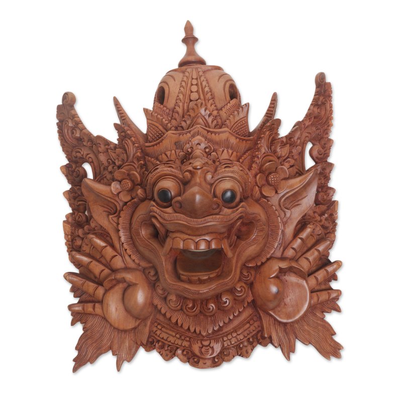 Ornately hand-carved from suar wood, this wall mask depicts Bhoma, a guardian spirit of Bali. Despite his fierce and frightening appearance, Bhoma is a good and friendly spirit that wards off evil. Wayan Nuliati of Indonesia presents the stunning mask.