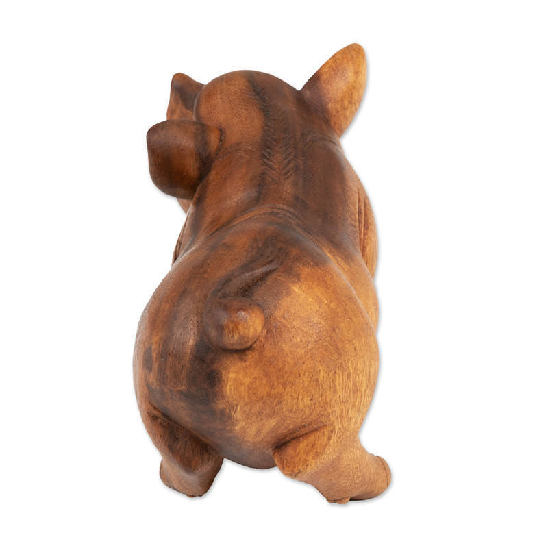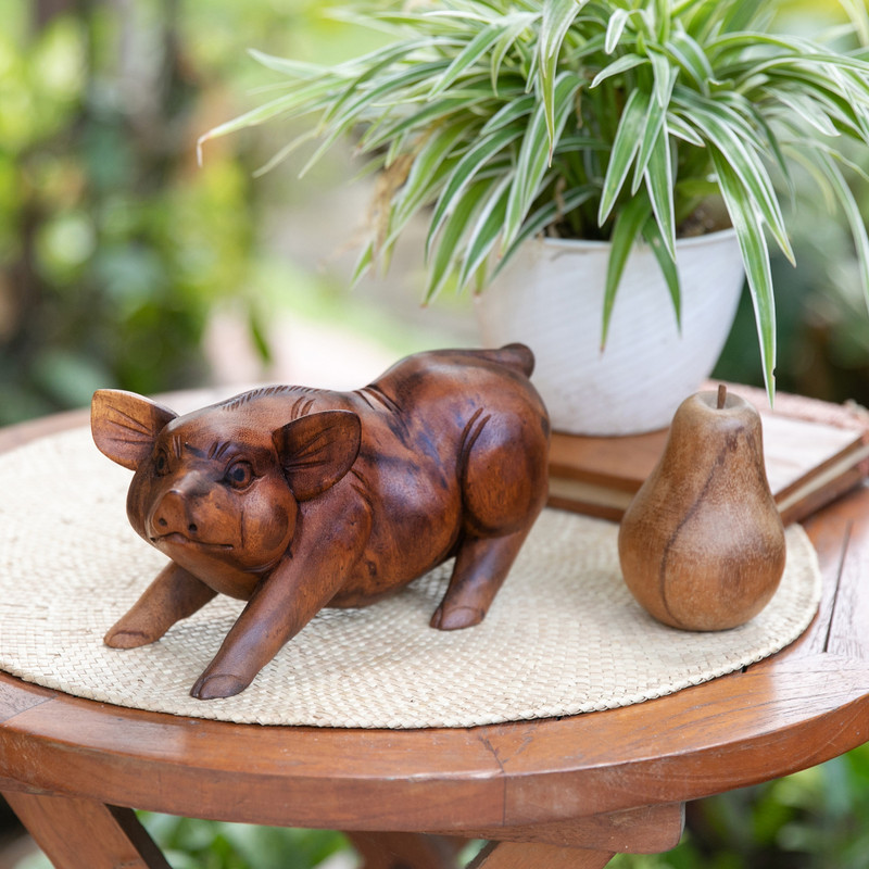Made Wirata of Indonesia presents this hand carved suar wood statuette of a pig standing his ground. The details in this carving capture plenty of character in this pig that, though little, has lots of determination.