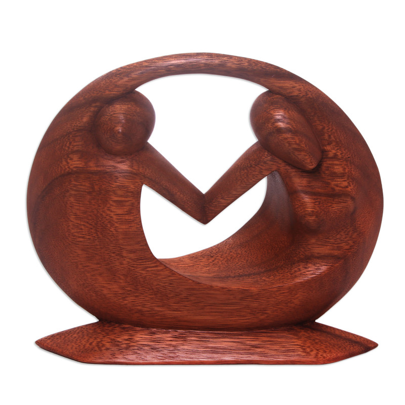 Hands clasped in harmony, two dancers form an unbroken circle of peace. Born of the limitless imagination of Nyoman Karsa, this suar wood sculpture symbolizes earthly peace, harmony and intimacy.