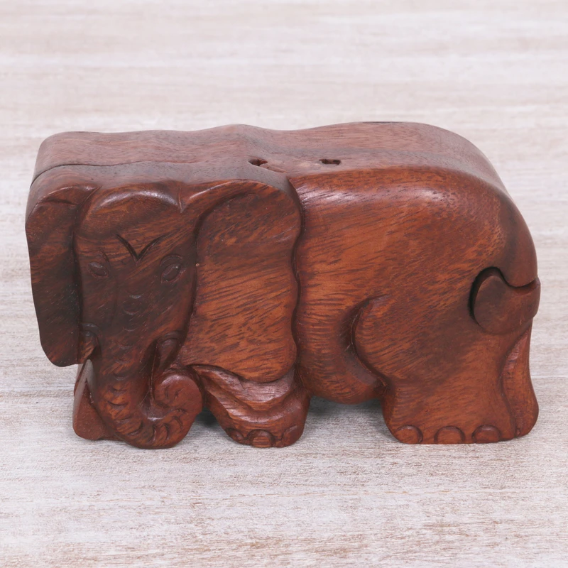 This curious puzzle box takes the shape of an enigmatic, staring elephant. Indonesia's Sarwaedi designs it from local suar wood, carving each piece by hand alongside his family for a beautiful look. It opens to reveal a single inner compartment for storing small items.