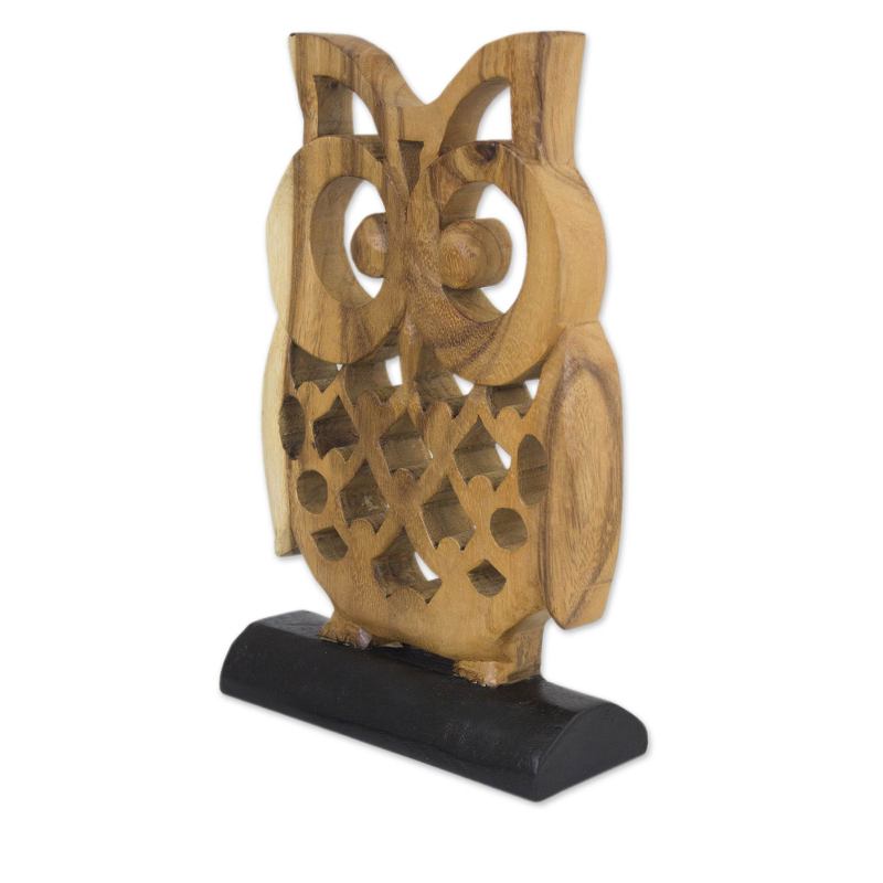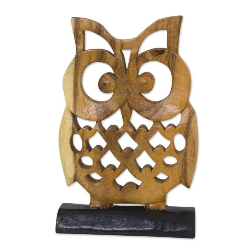 Simply adorable, this owl sculpture from Thailand invites admiration. Jaifah Aksornsri carves the sculpture by hand with precise openwork. She expertly preserves the natural grain of rain tree wood as she sculpts the feathery image perched on a black stand.
