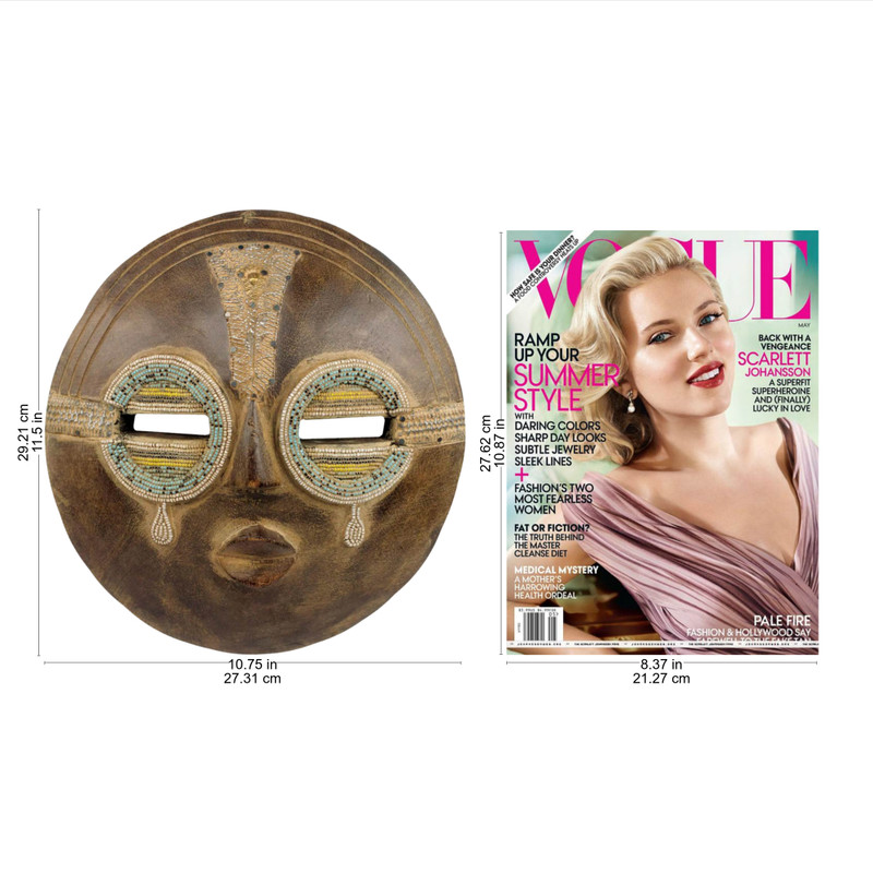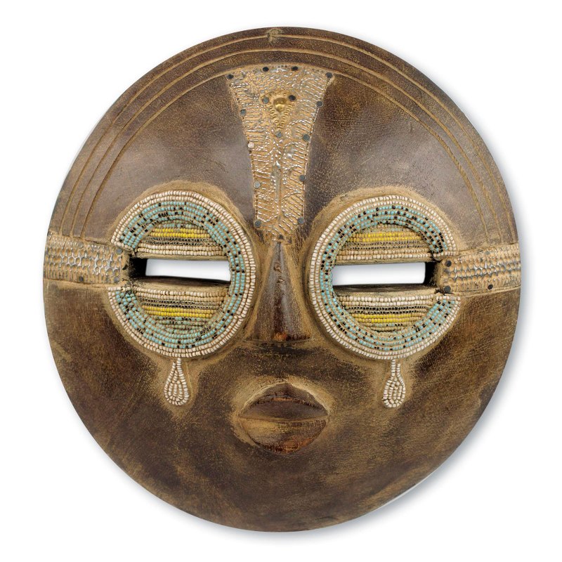 Smooth features reveal her youth, yet she is wise beyond her age. Tears spill from both eyes as great happiness overwhelms the girl. Rita Addo Zakour designs this beautiful African mask. Carved by hand of native sese wood, the mask features applications of aluminum repoussé, and beadwork surrounds the eyes. "Amidst extreme joy, some people shed tears," the Ghanaian artisan affirms.