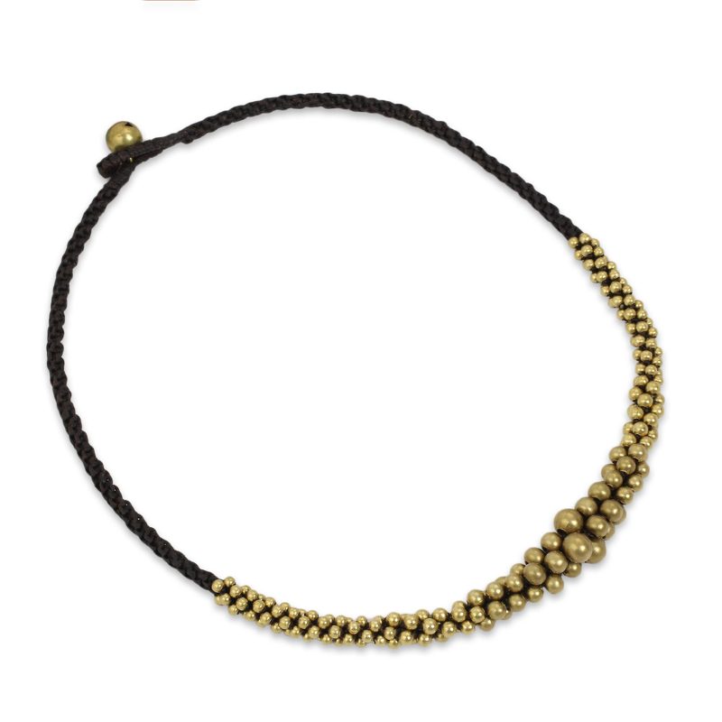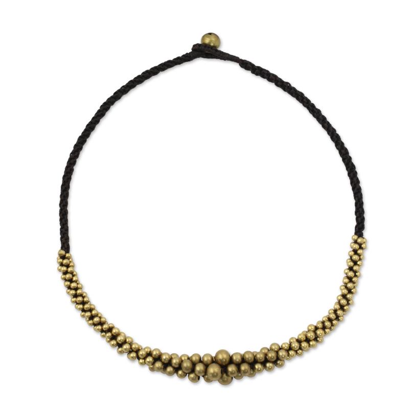 This necklace by Tiraphan Hasub exudes ethnic elegance. She weaves the necklace by hand, adding brass beads that cluster toward the center. A solitary brass bead, shaped like a bell, closes the necklace.