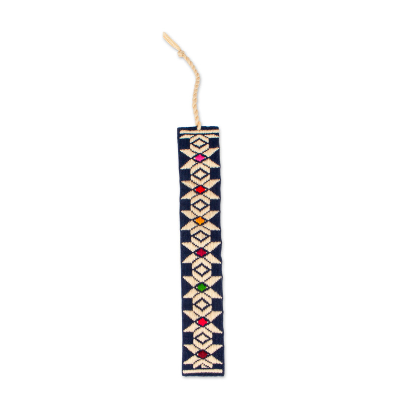 Artisan Angelina Gomez of Mexico hand crafts this lively bookmark. Made of navy cotton fabric, the bookmark is embroidered with multi-colored diamonds bordered in ivory geometric flowers.