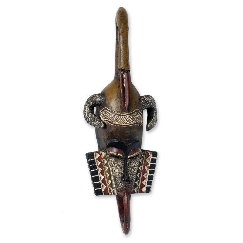 A bird perches atop this elongated mask and leans forward to caress the forehead with its beak. By Godfred France, it is crafted by hand of sese wood with applications of white clay for a vintage look. The Ghanaian artisan names his original design Okadi, a Ga word meaning "Identity."