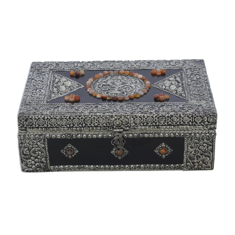 Lavish floral motifs on sleek black bring their own charisma to this jewelry box. Khalid Ali crafts the piece of mango wood, covering it in brass repoussé bathed in nickel. He lines the box with velvet and adds a lift out tray for smaller treasures. He then adds ornate handles, a mirror inside the lid, and a latch that can by locked.