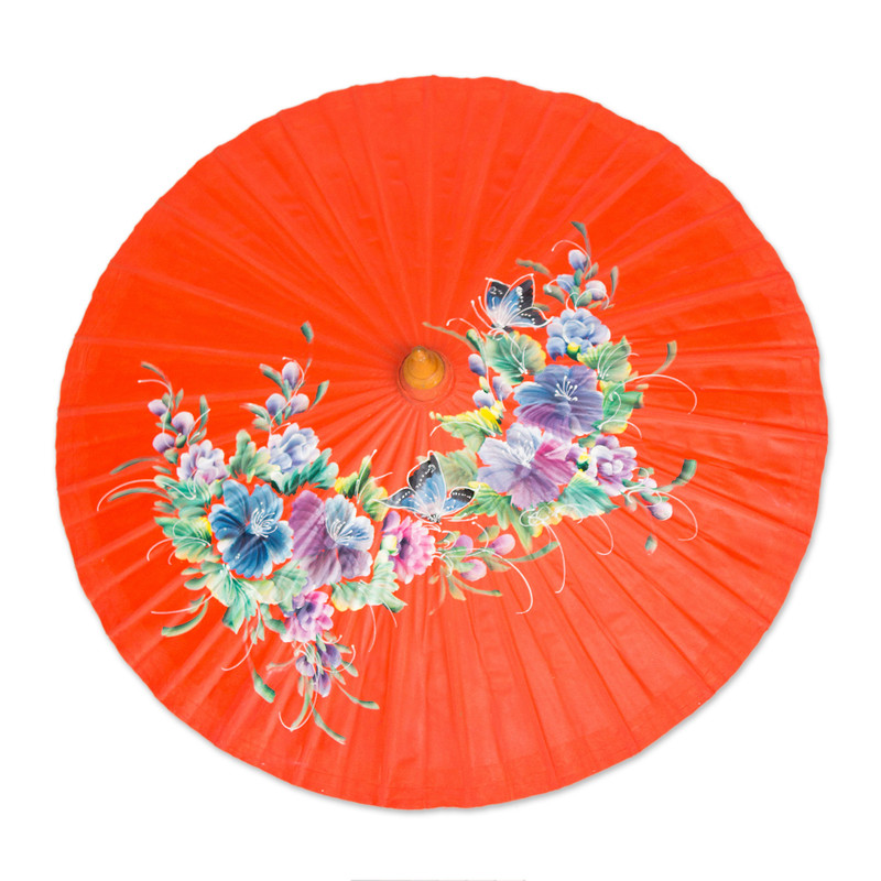 Butterflies alight amid blue wisteria and colorful hibiscus. By Nikom, this delightful orange parasol is crafted of bamboo and handmade saa, or mulberry bark paper.