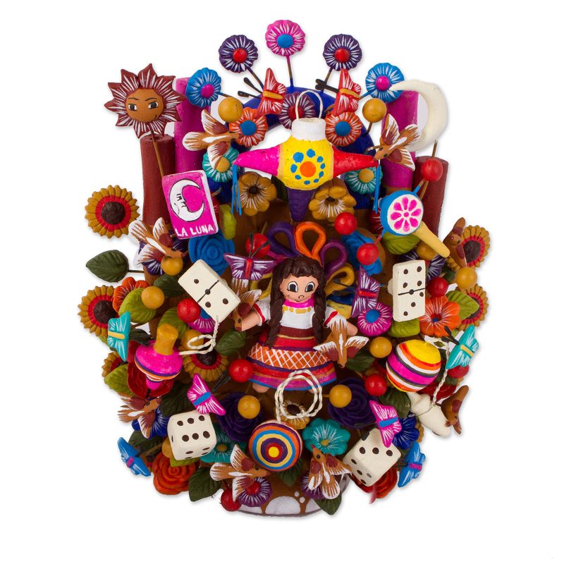 Javier Ramirez celebrates the variety of Mexican toys with this "tree of life" sculpture. In the center, a young girl in traditional clothing is surrounded by figurines depicting flowers and birds alongside piñatas, spinning tops, dice, and yo-yos, among other toys. Each piece is diligently crafted from ceramic and painted by hand, assembled by steel wire.
