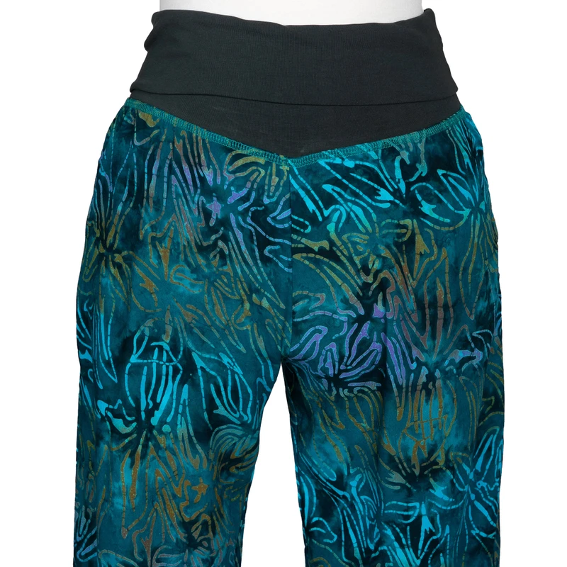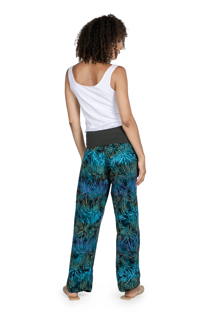 This exquisite pair of teal pants is brought to us by Galuh Kenanga of Bali. A fine design of kenanga flowers, or the cananga flowers of the ylang-ylang tree, is hand-printed on the pants using batik, a traditional dying technique. The relaxed fit, full-length pants feature a comfortable fold-down waist in a solid color.