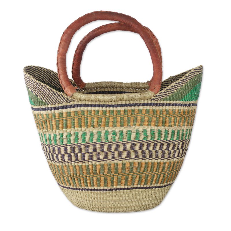 Ghanaian artisan Robert Ayine Anaba hand weaves this unique natural fiber tote bag. The bag is created from dyed raffia and features two leather straps. A striped motif in yellow, green and violet is featured on the front.