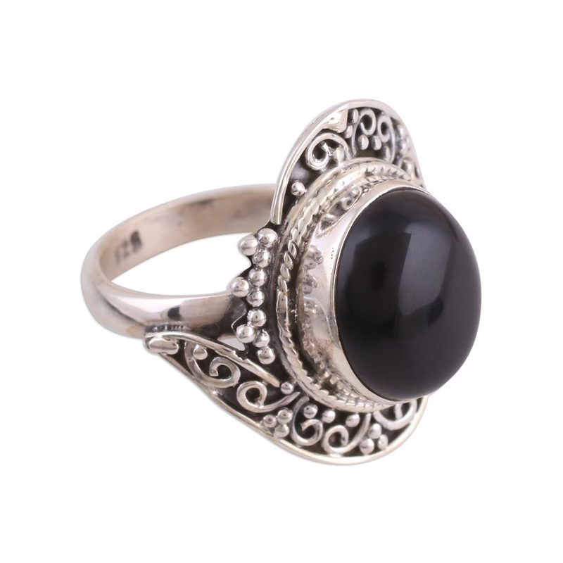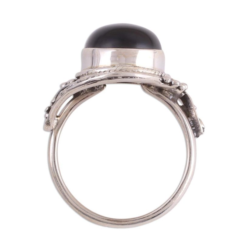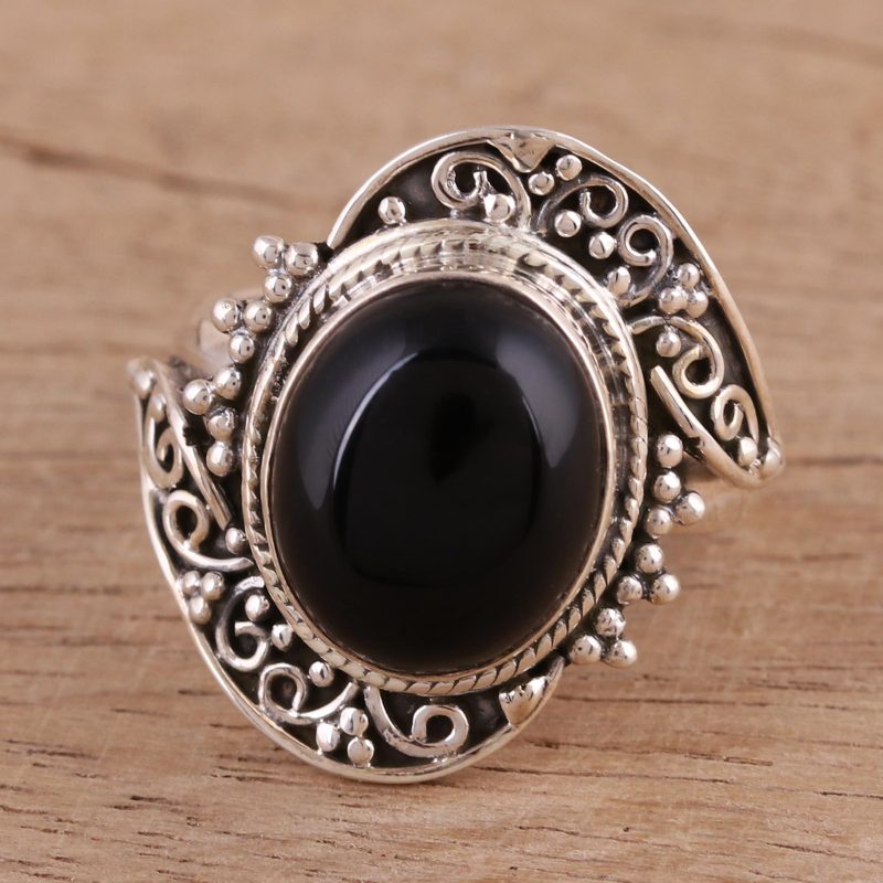 Presented by Alok Jain, this magical cocktail ring is designed by Indian artisans. They handcraft the ring of sterling silver, elaborating it with bubble and swirl motifs. A single cabochon of alluring black onyx crowns the ring.