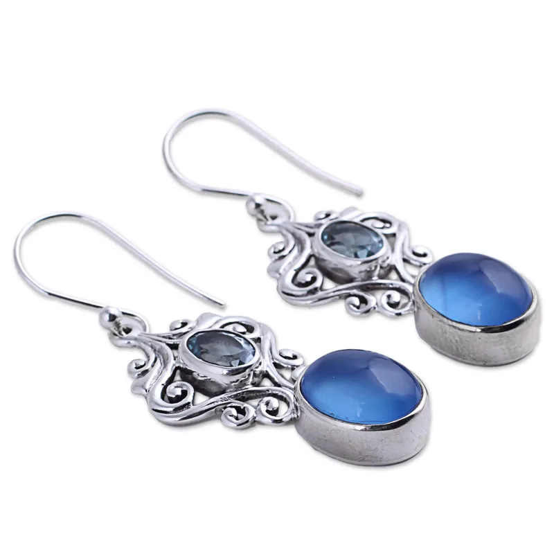 India's Neeru Goel presents a new awe-inspiring pair of earrings. Whimsical sterling silver tendrils surround a sparkling blue topaz gemstone at the peak of each dangle earring. Below, a blue oval cabochon chalcedony stone is suspended from the high-polish sterling silver frame, making the calm blue tones the center of attention.