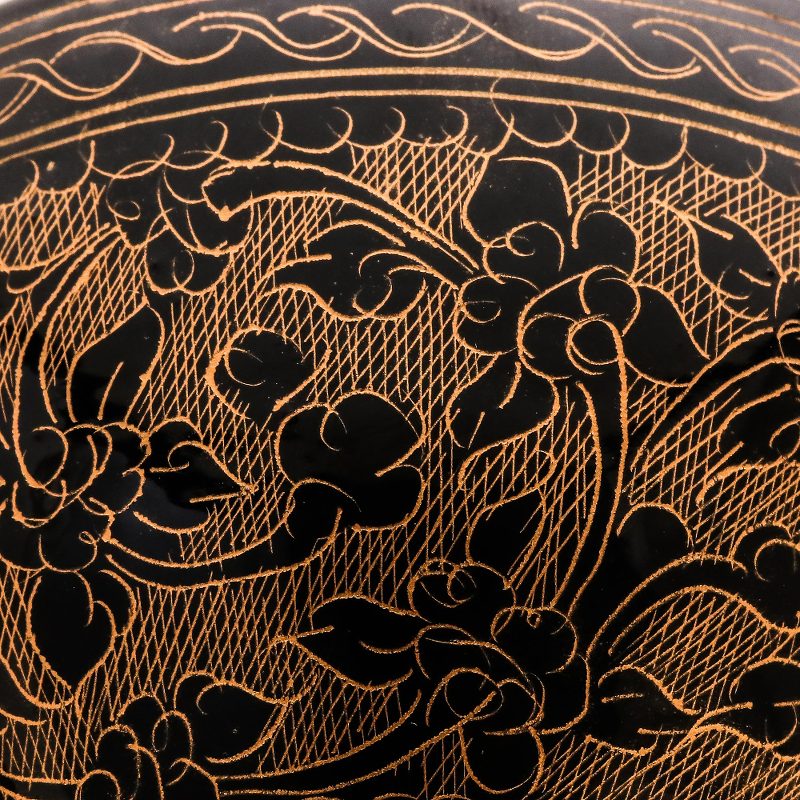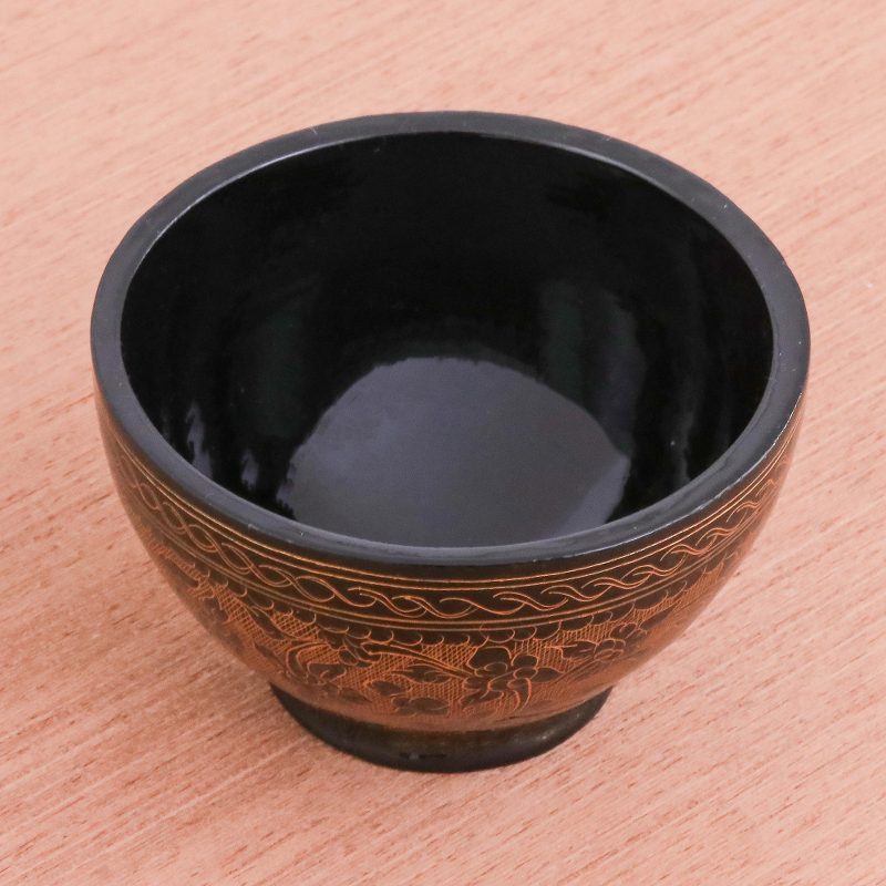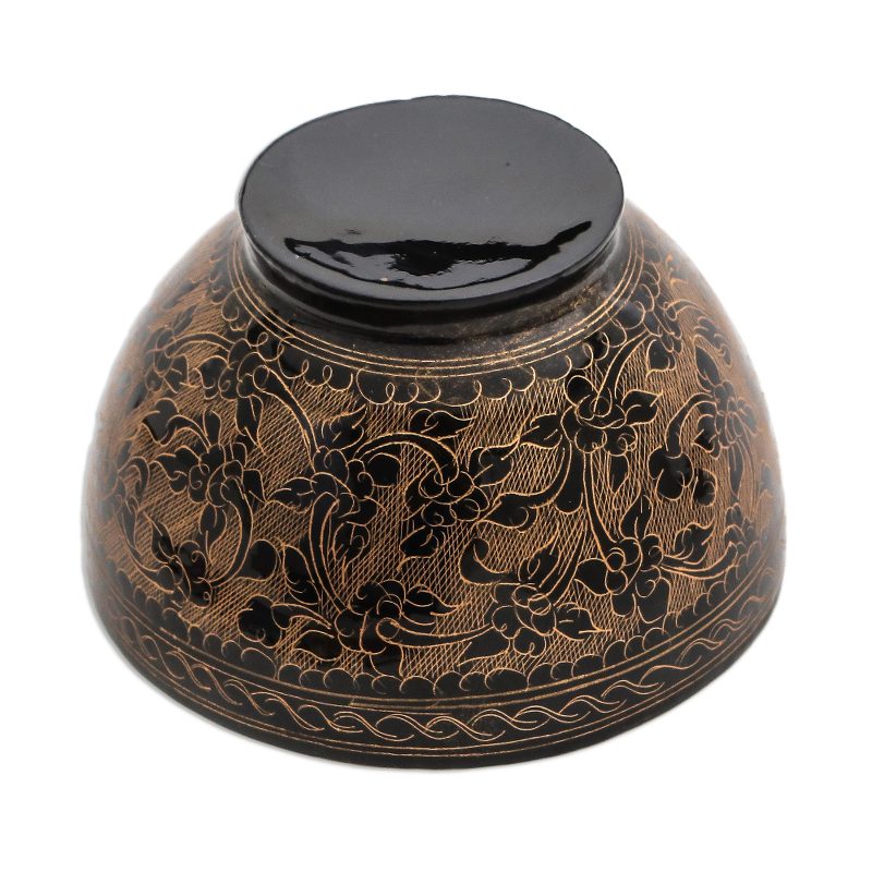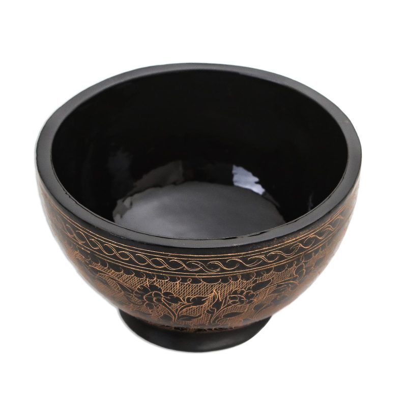Glossy mango wood hosts a forest of flowers in a work of art by Nantana Sompamitre This exquisite bowl is lacquered inside and out; the green blossoms are etched by hand. She lathes the mango wood into the desired shape and coats it with lacquer. When dry, it is polished, and another coat is applied – up to twenty times – before as many six coats of pure lacquer are applied. The final layer is polished with powdered fired clay.
