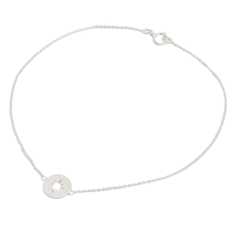 Crafted by hand, this delightful anklet features a circular medallion with brushed satin textures. In the center, a cutout shape depicts a compass. Jantana in Thailand selects sterling silver to handcraft her original design.