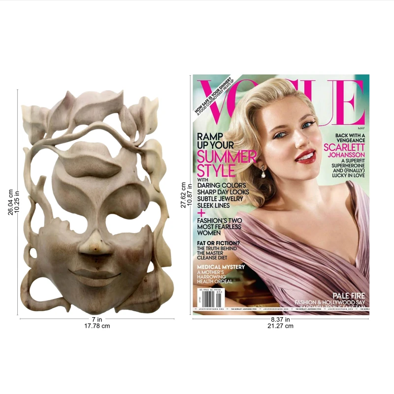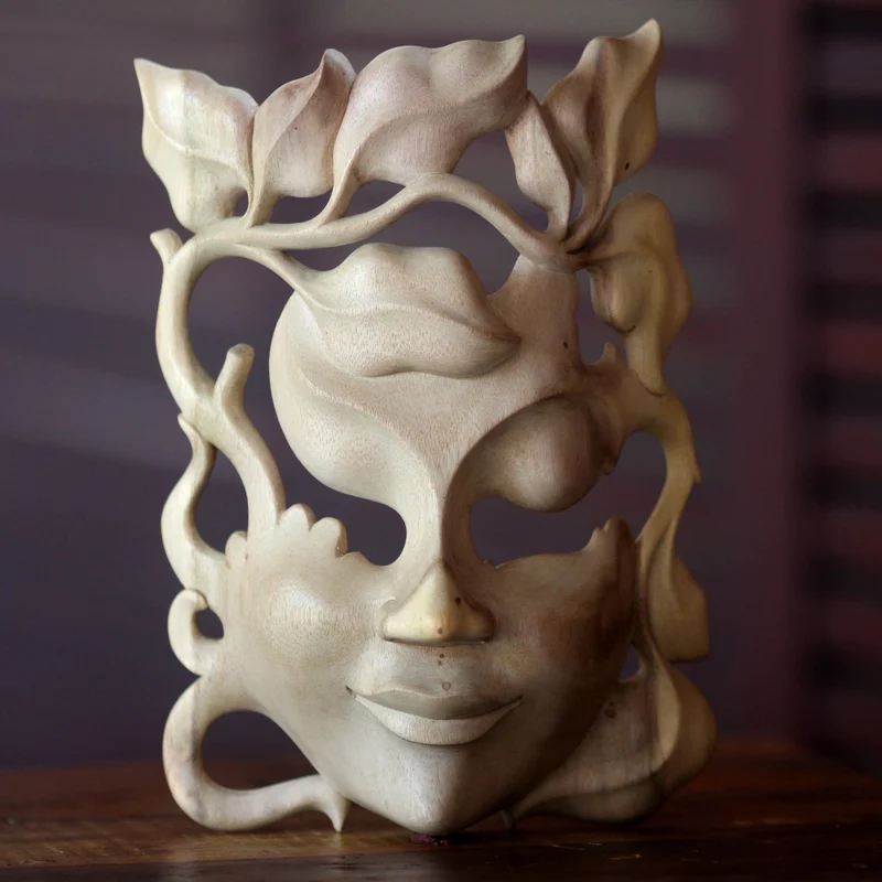 "Peoples' many personality quirks inspired this design," says Eka of this hand-carved hibiscus wood mask. Morphing into a floral motif, the mask smiles in serene ecstasy.