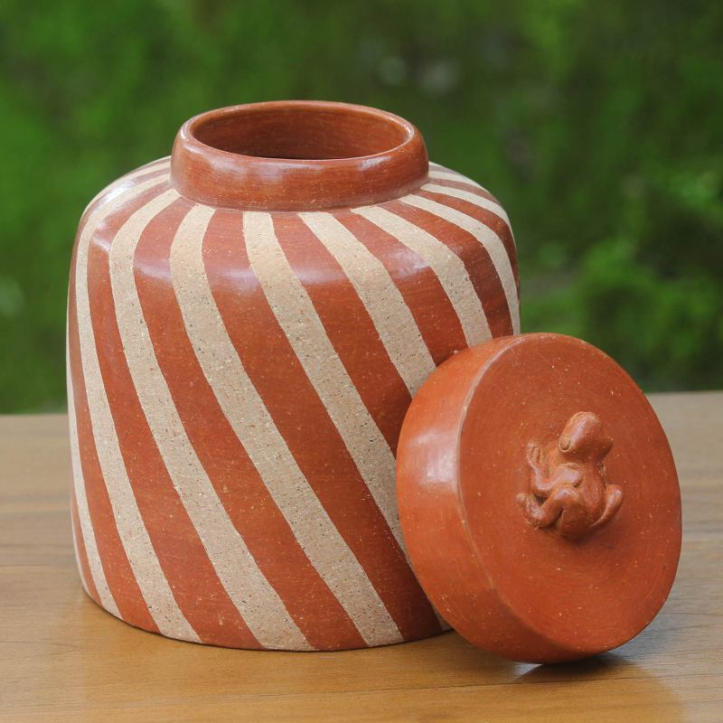 Women from Lombok Pottery Center create the whimsical design of this jar featuring a frog on the lid. In Indonesia, frogs are believed to bring good luck. The artisans craft the terracotta jar at home and adorn it with diagonal stripes etched freehand, creating a contrast of color and texture.
