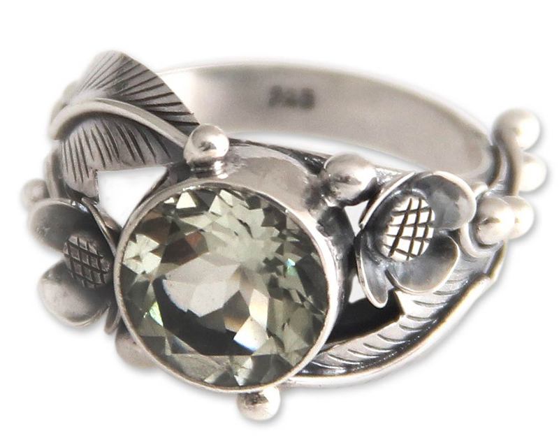 Escorted by sunflowers, prasiolite glows with light green splendor in a ring designed by Dewi Putera. The ring is crafted by hand with sterling silver in sublime detail.