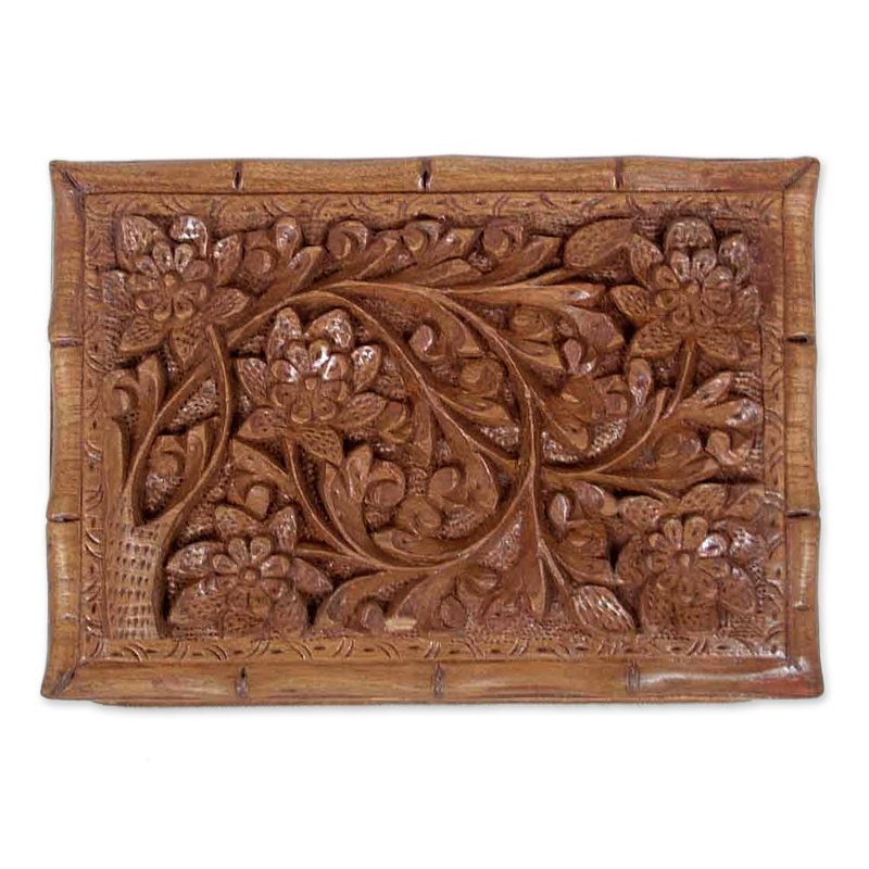 Flowers blossom in sublime opulence, their petals raised with delicate wonder to render this jewelry box exquisite. Carving with a vast elegance, M. Ayub creates this extraordinary jewelry box from Kashmiri walnut wood. The box opens up to two compartments lined with soft red velvet, and a smaller one is featured for rings. The box also features a magic lock and can be opened by sliding the lower front panel of the box to the right side.