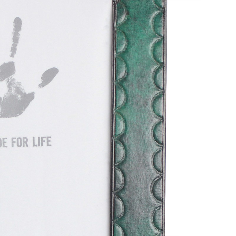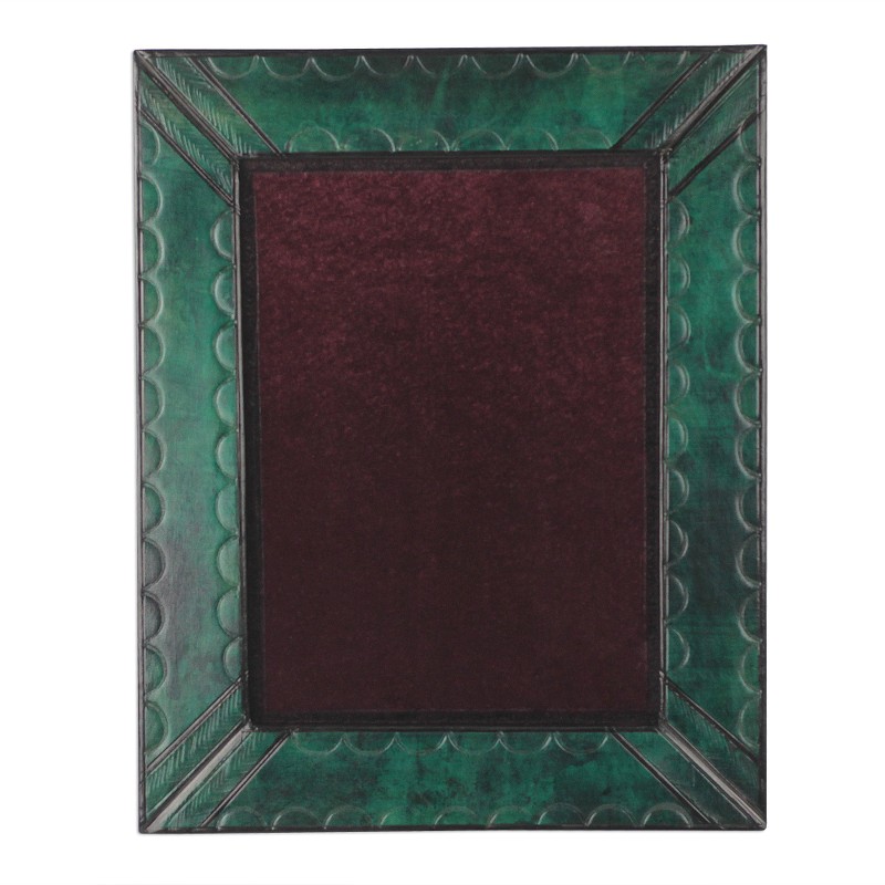 Handcrafted of green leather, this fantastic wall photo frame is designed by Ghanaian artisan Kamal Mohammed. Curving patterns decorate the frame's edge, and the interior is lined in suede. A favorite 8x10 photo can be inserted through the side of the frame.
