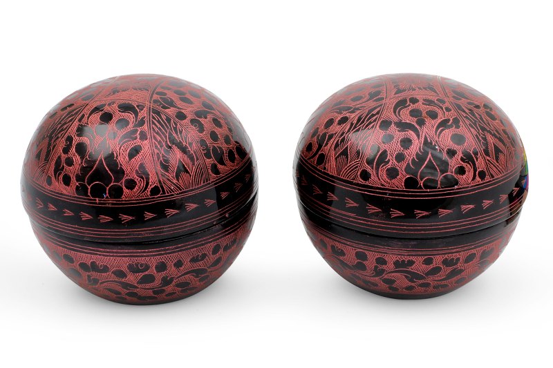 Shaped like florid spheres, these decorative boxes by Nantana Sompamitre are filled with the charm of Thai artistry. Each mango wood box is crafted by hand featuring pink wildflowers over glossy black lacquer.