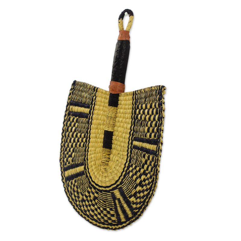 Ghanaian artisan Robert Ayine Anaba hand-weaves this beige and black fan of raffia fibers with a leather handle. Perfect for wall display or for daily use, it brings a glimpse of the African savanna to any setting.