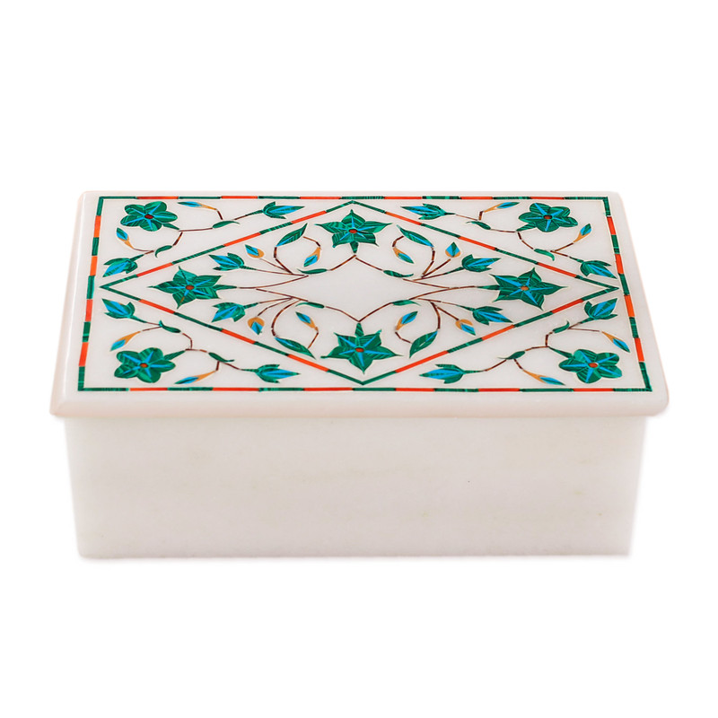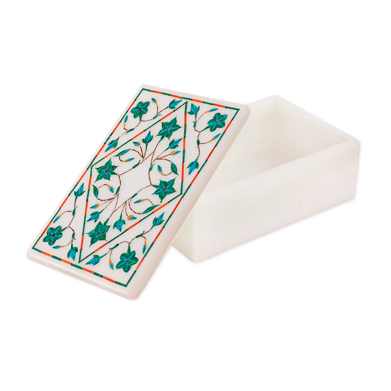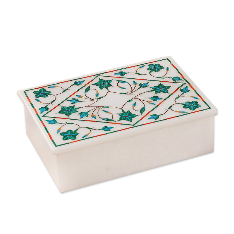 India's Imran demonstrates the art of inlay with the florid design on this jewelry box. Working with the techniques used in the Taj Mahal, he crafts the marble jewelry box by hand with opulent artistry.