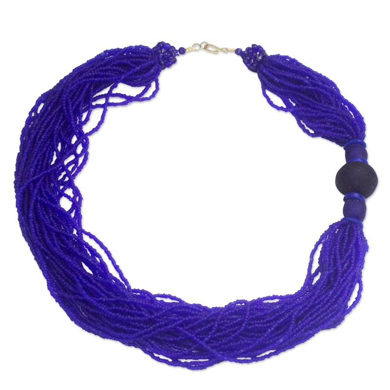 Ghana's Eva Asantewa Amakye presents a charming necklace to celebrate the melodies of bluebirds. Tiny recycled glass beads in royal blue are strung to create multiple textured layers, featuring three larger focal beads on one side.