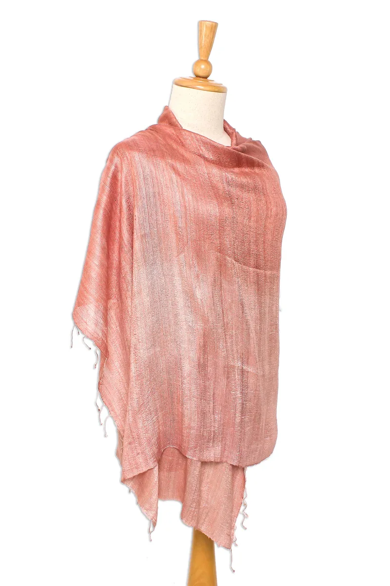 Soft pink turns into deep rose in a delicious palette of colors orchestrated by Vinita for this wide shawl. She works with traditional dyeing techniques to create a shawl of bold elegance that is loomed of raw silk.
