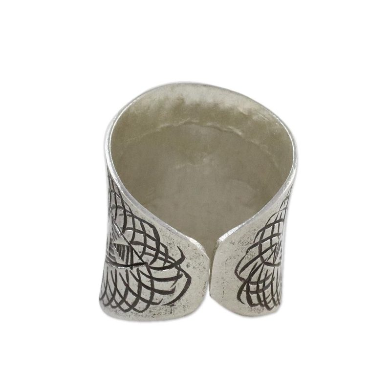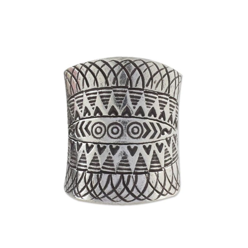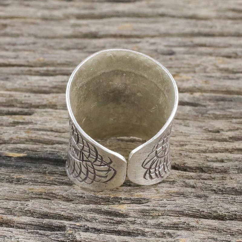 Exotic designs are engraved into this striking sterling silver band ring. Crafted by artisans from the hill tribes of Thailand, the ring is presented by Achara.