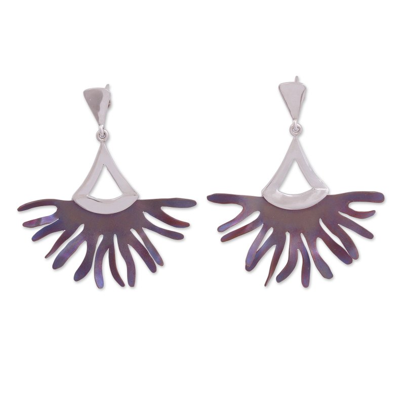 Inspired by the fins of dragon betta fish, two shapes are handcrafted of titanium with a glimmering violet finish. Mexican artisan Diana Solis enjoys working with titanium, inspired by the ease with which she can alter the metal's colors and hues. These dangle earrings are accentuated with sterling silver.