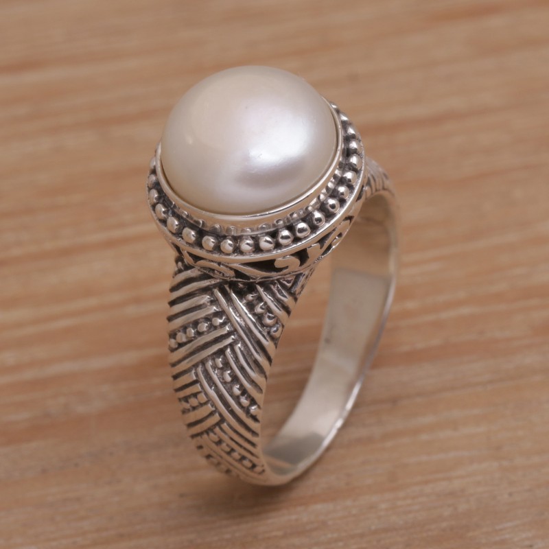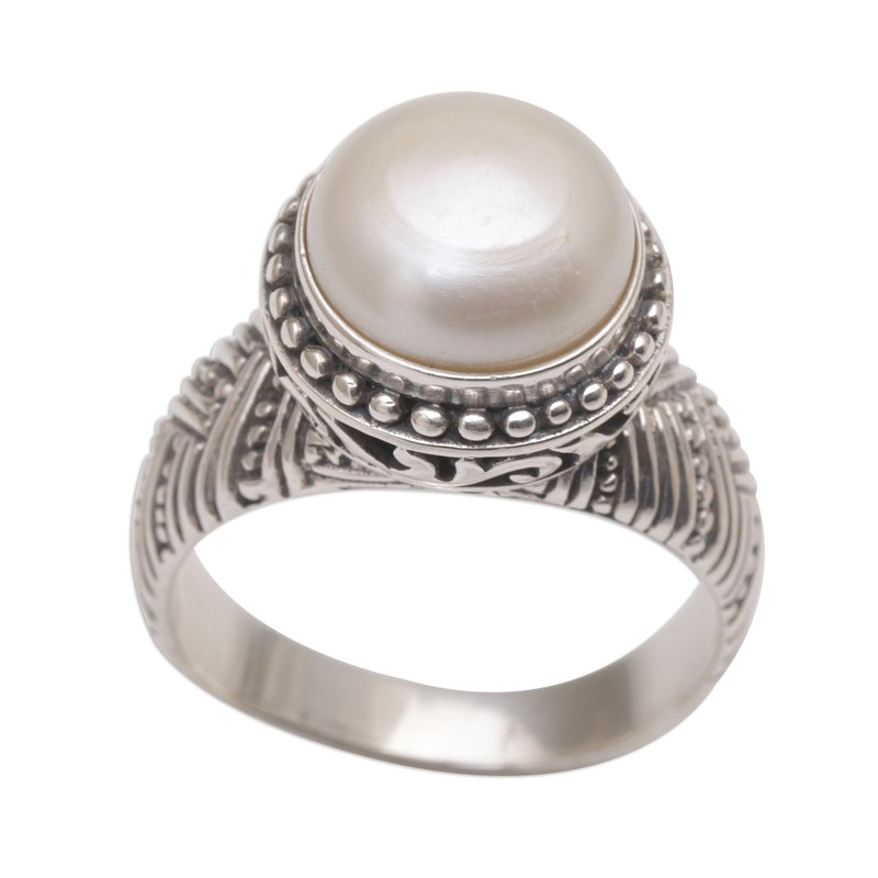 The intricate, woven-motif band of this 925 sterling silver cocktail ring is designed and created by Balinese artisan Made Sugi. The technique used to craft this elegant ring lets every intricate detail shine. The dot-motif setting holds a lustrous cultured pearl perched prominently on top.