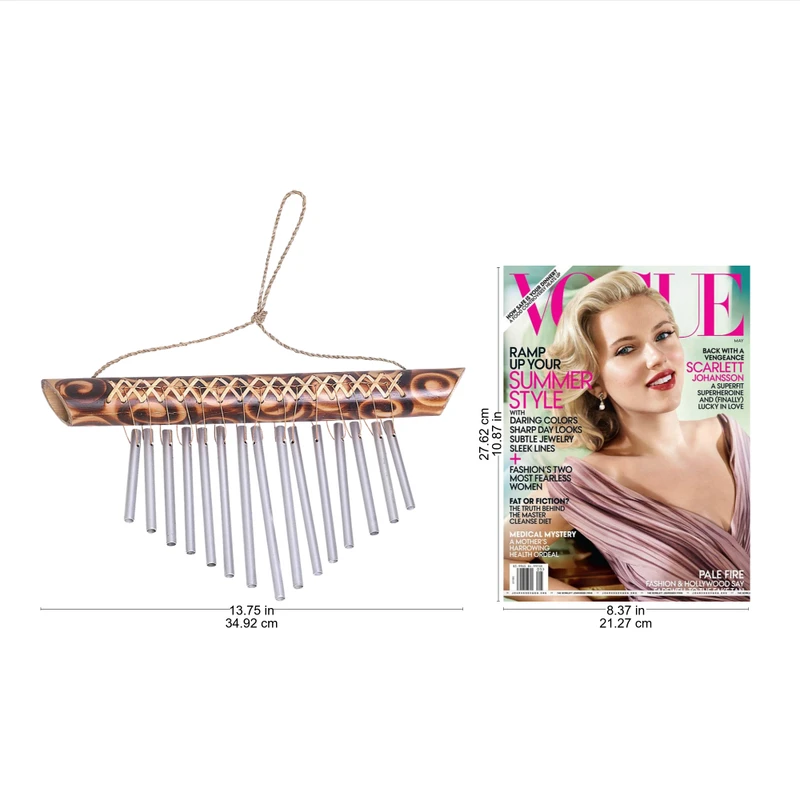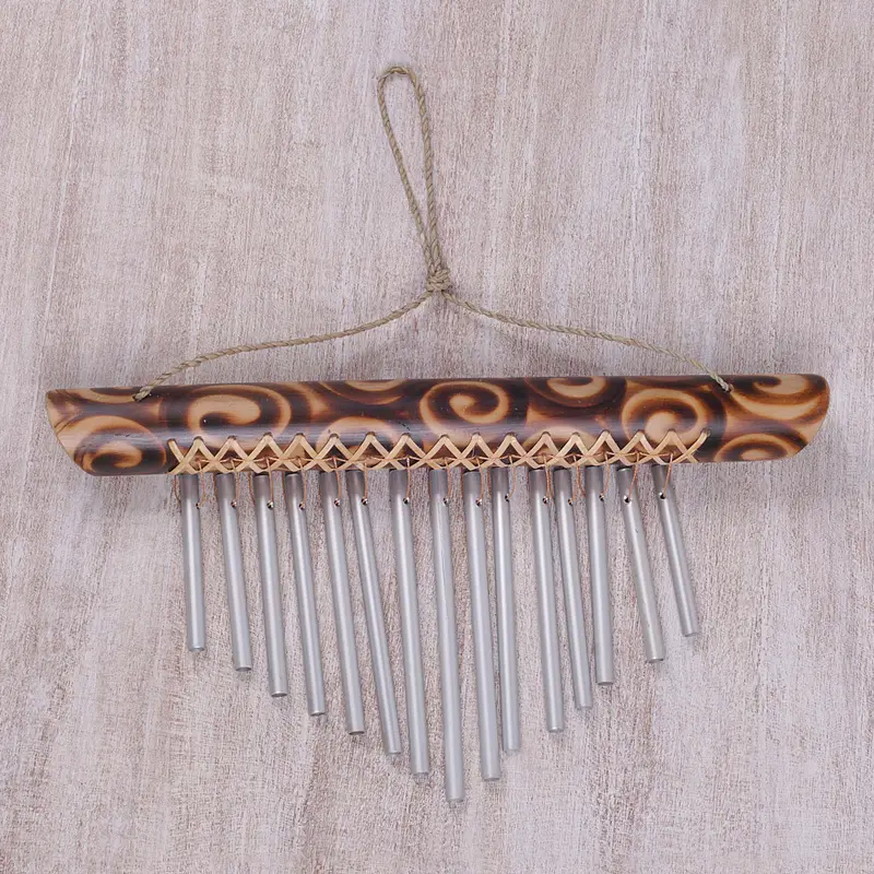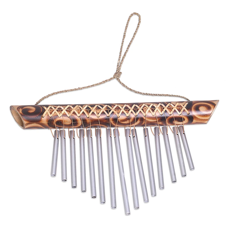 Balinese designer Trisna Dewi presents this handmade wind chime made from bamboo hand painted with a unique swirl motif. Sit back, relax and listen to the serene sound of the tuned aluminum tubes that complement every calm wind.