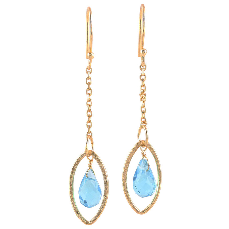 Vivek Nathany of India designs this stunning pair of dangle earrings in 22k gold-plated sterling silver. Their almond shapes feature faceted blue topaz gemstones, swaying in the center of the ovals.