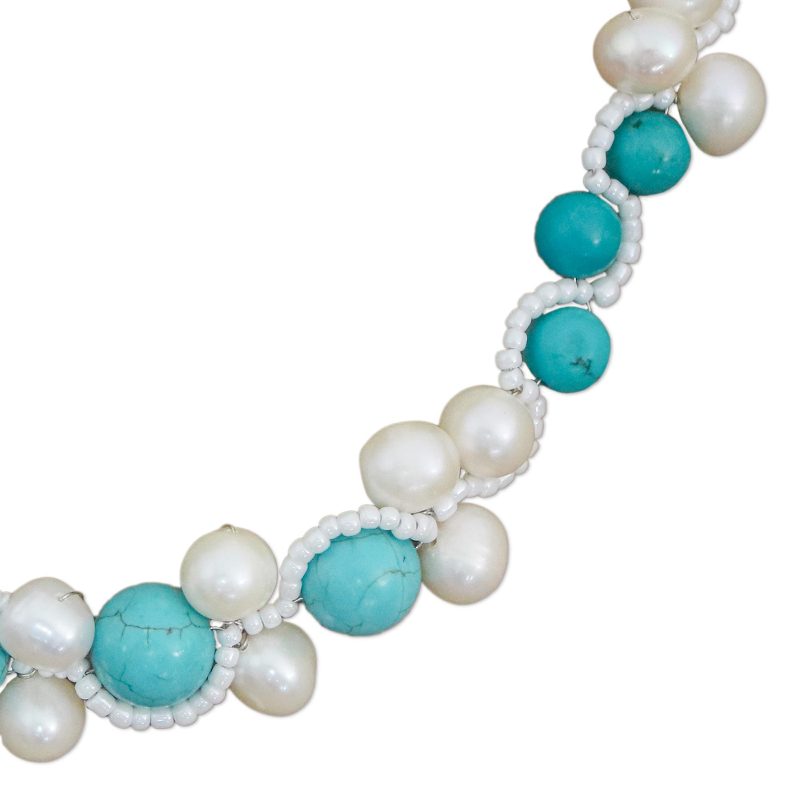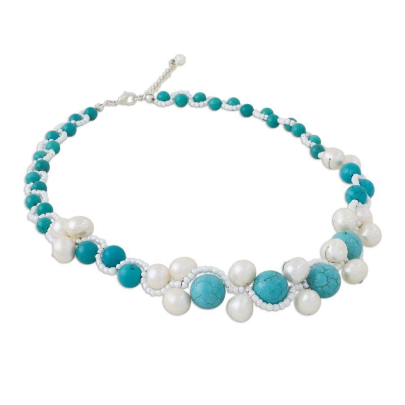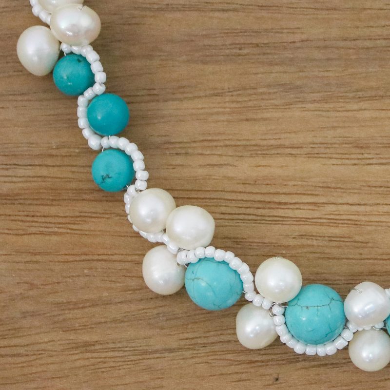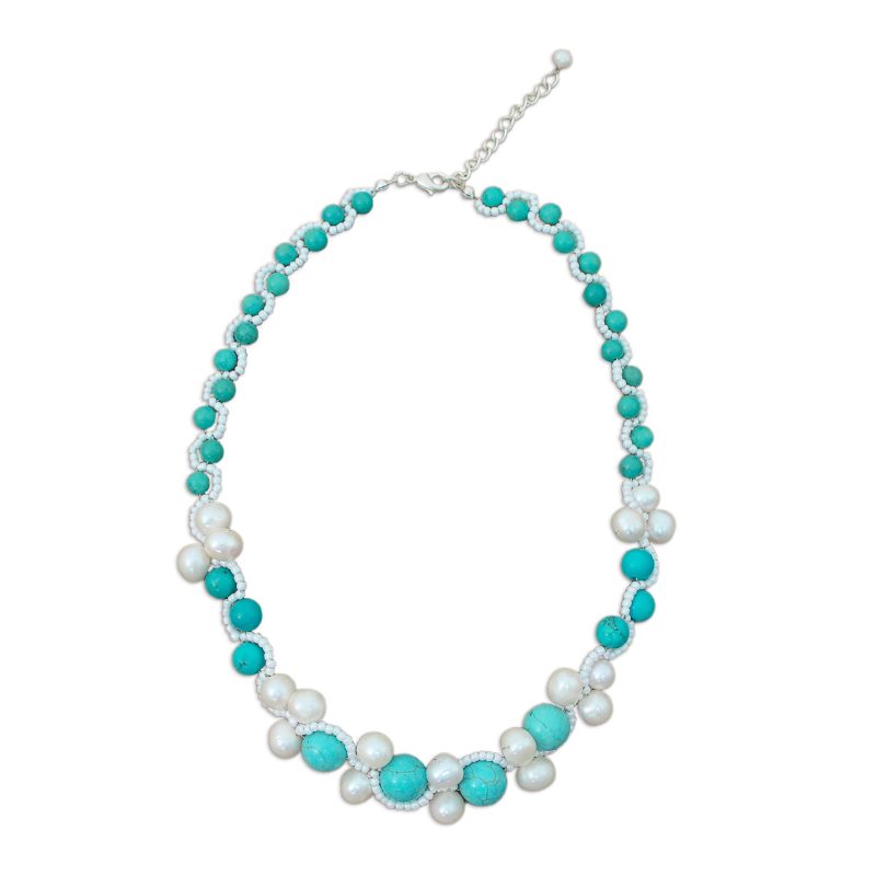 With a striking, white snake of glass beads surrounded by an array of cultured pearl and calcite, this necklace is an intricate combination of contrasting colors. Thai artisan Sasina crafts the necklace with a silver-plated extender chain to ensure the perfect fit each time you wear it.