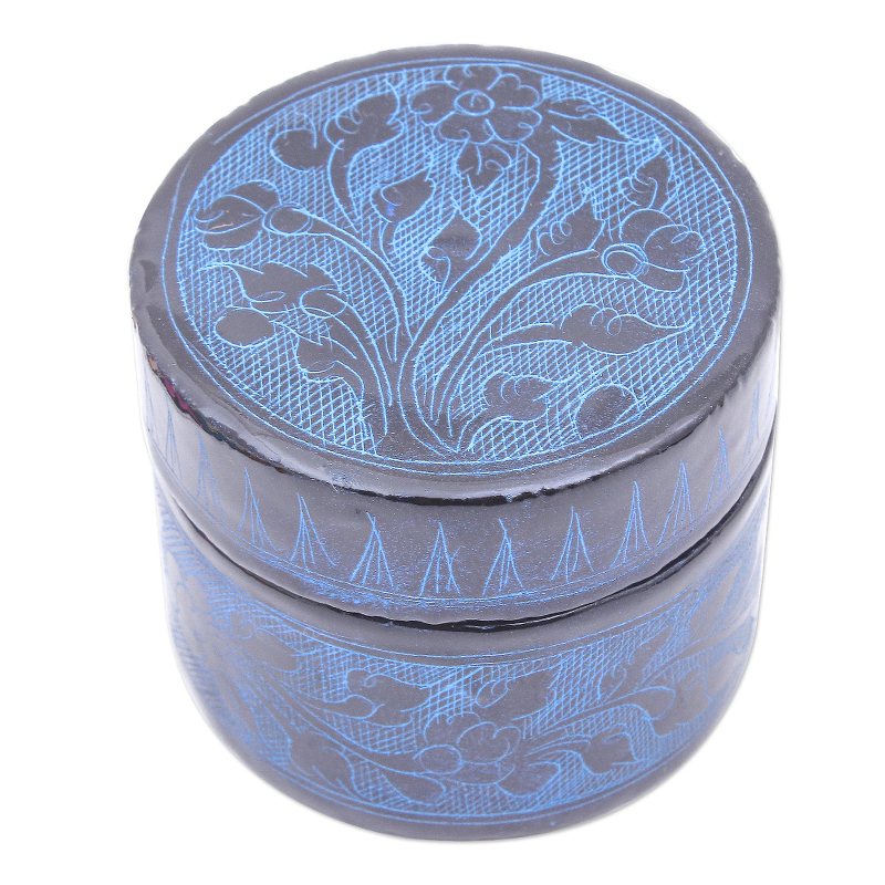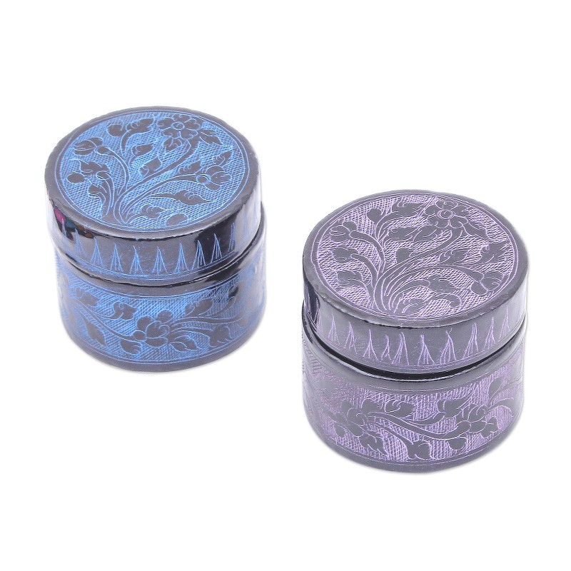 Keep your tiniest treasures safe and secure with these adorable mini decorative boxes from Thai artisan Nantana Sompamitre. Crafted from mango wood, the round boxes are hand painted in blue and purple, engraved with a floral design, and treated with a glossy lacquer finish.
